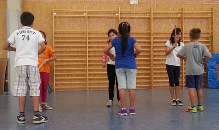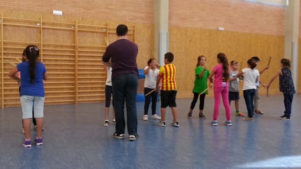 Els alumnes de Cicle Mitjà quinzenalment dins l’Àrea d’Educació Física fan ball de bastons gestionat per l’Associació de bastoners del Raval i el professor d'E.Física.